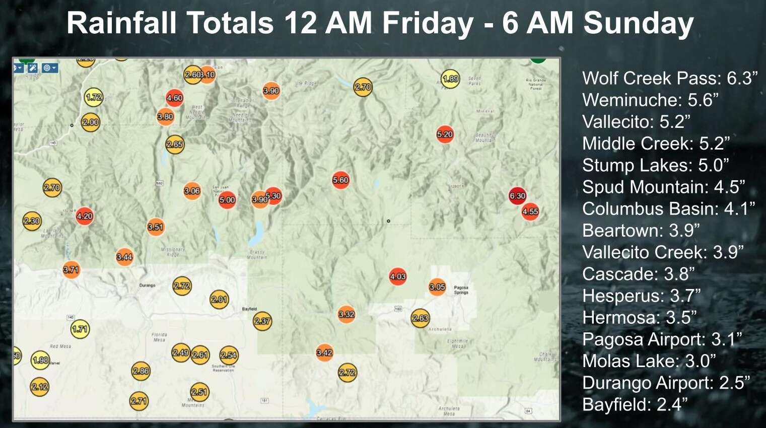 Weekend rains prompted the evacuation of about 390 homes in northern Vallecito after up to 5 inches of rain fell locally, pushing Vallecito Creek to 7,200 cubic feet per second and triggering widespread flooding in the area.