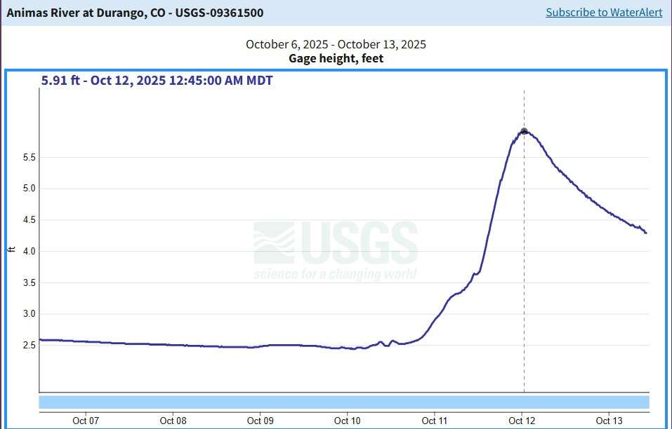 In addition to Vallecito Creek’s heightened flows, other rivers in the area experienced record water levels, according to National Weather Service flow data. The Animas River surged from 581 cfs at 12:01 a.m. Saturday to 4,820 cfs at 1 a.m. on Sunday.