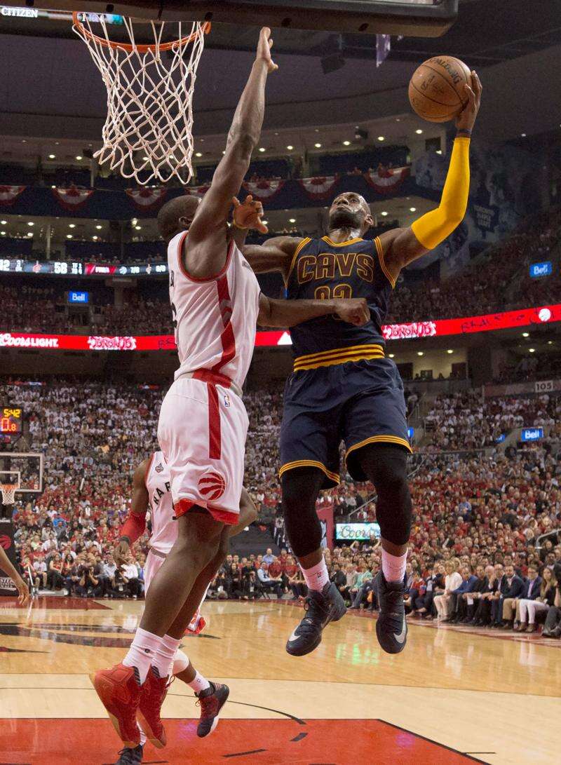 Cleveland Cavaliers forward LeBron James found it difficult to drive against Toronto Raptors center-forward Bismack Biyombo, who had 26 rebounds for Toronto in a big Game 3 win in the Eastern Conference finals.