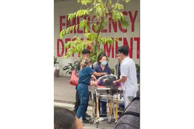 Health workers rush a person injured by an earhtquake to a hospital compound in Davao city, Philippines Friday, Oct. 10, 2025. (Meggy Macion Santos via AP)