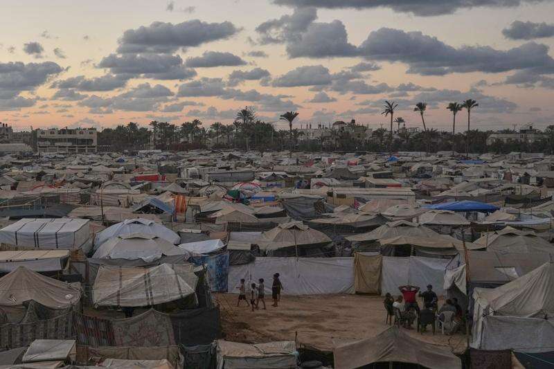 Dusk falls as a group of Palestinians sit outside a tent at a temporary camp in Deir al-Balah, in the central Gaza Strip, Monday, Oct. 6, 2025. (AP Photo/Abdel Kareem Hana)