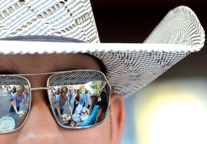 The Basin High School Rodeo Club held its annual pie auction and street dance fundraiser in front of the Durango & Silverton Narrow Gauge Railroad & Museum on Thursday evening. Cassidy Deyapp, 17, son of Dawn and Justin Deyapp of Pagosa Springs, volunteered for the effort by serving barbecue to hungry visitors. The event was part of Durango Fiesta Days.
