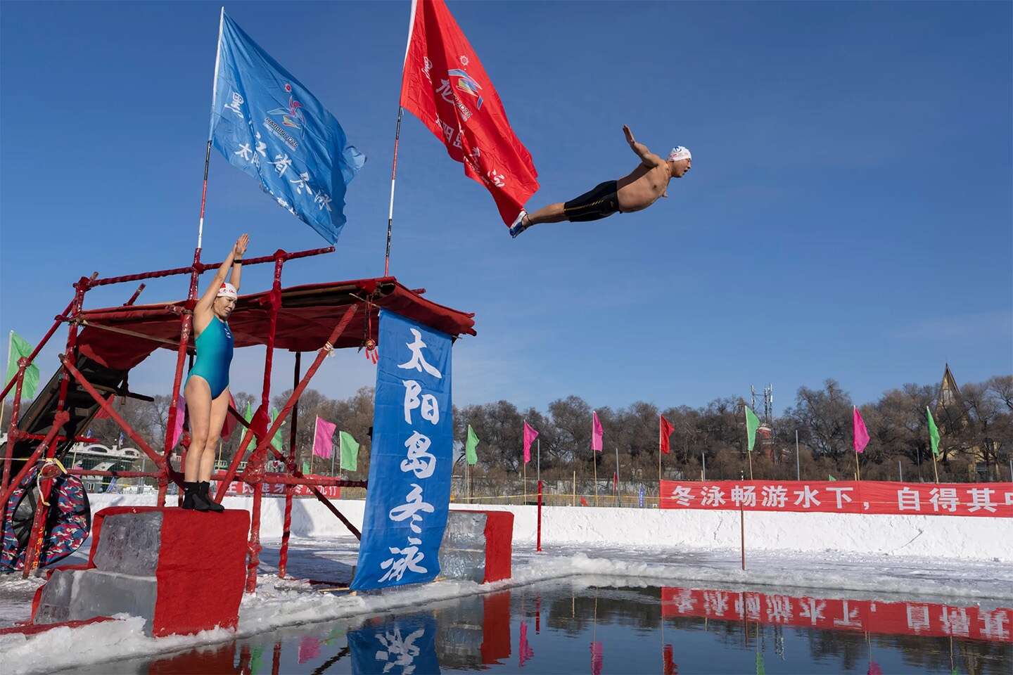 Winter swimmers take to the water in Harbin in China’s Heilongjiang province on Sunday, Jan. 4, 2026. (Ng Han Guan/Associated Press)
