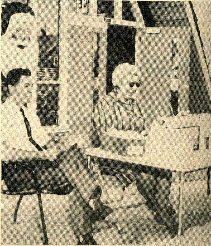 Herald photo<br><br>This photo appeared in the Dec. 19, 1962, paper the cutline read: “It was springtime (almost) in the Rockies, up until this morning, at least, and the unseasonable weather brought some strange sights. This is one of them – Chamber of Commerce Manager Mike Valentine and secretary Marie Donaldson moved their equipment out onto the patio in the sunlight, to address Christmas cards of all things, with the decorator’s Santa looking over their shoulders, Marie was wearing sunglasses and Valentie has his shirt sleeves rolled up. And all on Dec. 18.”