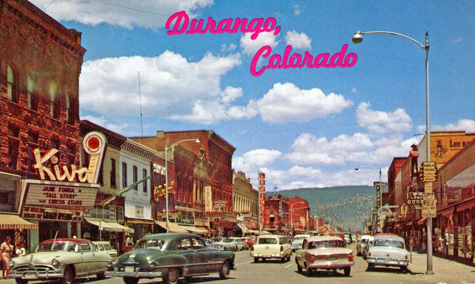 This postcard photograph captures the 800 block of Main Avenue during the summer of 1960.Although the movie “Tall Story,” starring Jane Fonda, was released in April of that year, it would notbe shown at the Kiva Theater in Durango until several months later, as films typically arrived in thearea long after their initial release. This image provides a clear view of the buildings destroyed in the1974 downtown fire. The fire burned every structure between the Kiva Theater and the light-coloredLevine’s building at the north end of the block. Today, the Main Mall occupies thisspace. – Ed Horvat for Animas Museum, edhorvat@animasmuseum (Catalog Number: 03.53.59 from the La Plata County Historical Society Photo Collections)