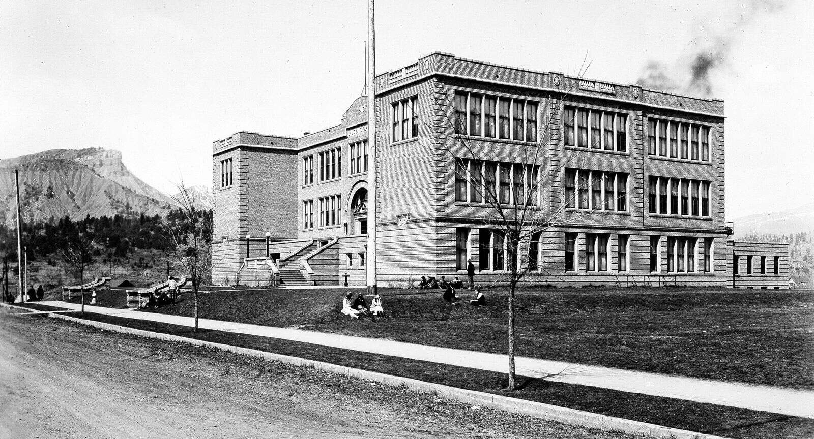 This is how Durango High School appeared shortly after its construction in 1916. Located at 201 E. 12th St., most of the surrounding property was still empty at the time. Perins Peak is to the left in the background. The smoke coming from behind the building is from the coal-fired boilers at the Western Colorado Power Plant, now the Powerhouse Science Center. This building will become the new Durango City Hall after a complete remodel scheduled to begin in 2026. – Ed Horvat for Animas Museum, edhorvat@animasmuseum.org (Catalog Number: 92.22.136.2 from the La Plata County Historical Society Photo Collections)