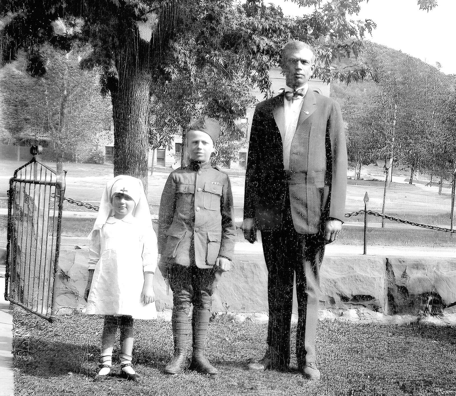 This photo shows the C.C. Perkins family in front of their home at 1237 East Third Ave. during or shortly after World War I. It was a common practice at the time to dress children as soldiers or nurses to show patriotic support for the war effort. Clayton C. Perkins married Zaidee Rockwood in 1901 in what was then considered an elaborate wedding at the First Presbyterian Church on Third Avenue. Perkins was in the real estate and insurance business with his father-in-law, Tom Rockwood. These are two of his four children, likely his youngest daughter, Luella, and son Gilbert. The old Central High School is visible behind them at the corner of 12th Street and Fourth Avenue. – Ed Horvat for Animas Museum, edhorvat@animasmuseum (Catalog Number: 98.32.29 from the La Plata County Historical Society Photo Collections)