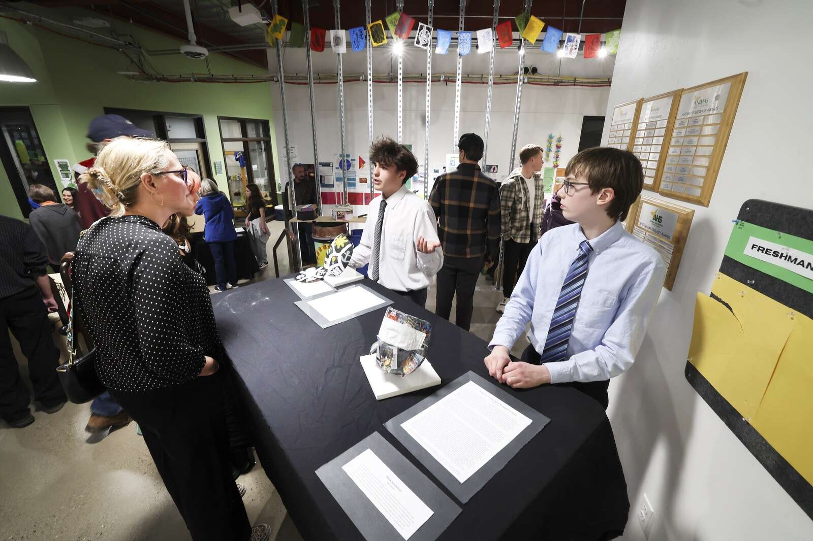 Kathleen Goodman listens to Animas High School student Reece Twohig, 14, talk about his modeled mask as fellow student Zane Esterday, 15, looks on Tuesday during the first exhibition for AHS students of this school year. (Jerry McBride/Durango Herald)