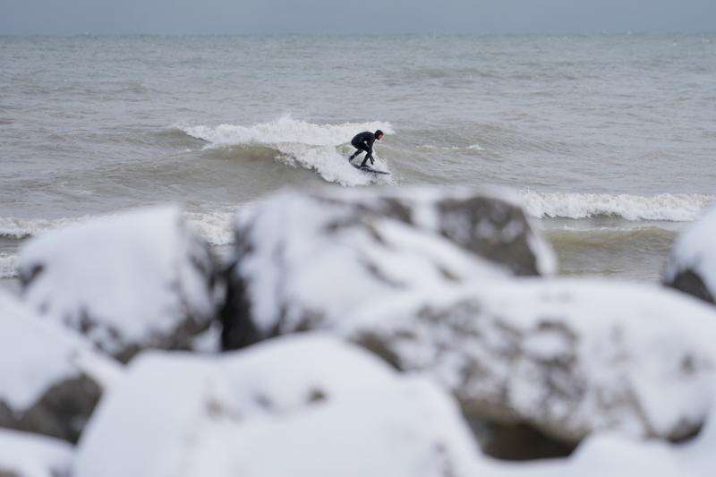 A surfer catches a wave as snow covers the ground n Evanston, Ill., a suburb of Chicago, Monday, Nov. 10, 2025. (AP Photo/Kiichiro Sato)