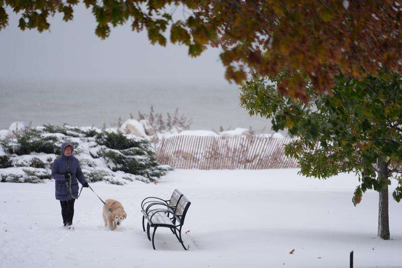 A person walks her dog along Lake Michigan as snow covers the ground with fall colors on the trees in Evanston, Ill., a suburb of Chicago, Monday, Nov. 10, 2025. (AP Photo/Kiichiro Sato)