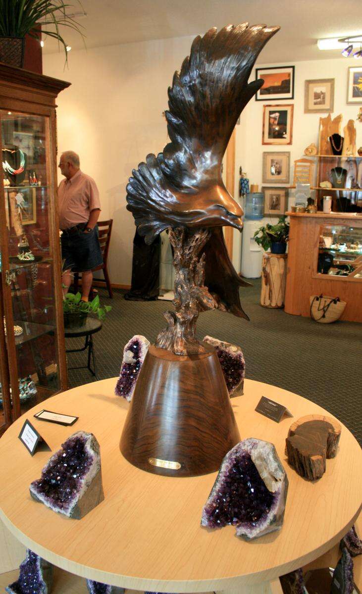 Featured artists include Kelly Black; Tim Cox known for his depictions of cowboy life; hand-painted ceramics by Anne Verivaet of Durango; thunder gourds by Cindy Cuthbert (they really sound like thunder); glass bowls by Amy Stuck of Ignacio; and Pine River Pottery by Connie Mason Bennett. Wearable art - AKA jewelry - is displayed by Connie Cyprian and Myrna Jacobson. Marilyn Cross of Bayfield has her oil paintings on display, and Kasey Correia of Ignacio has raku spirit dancers.