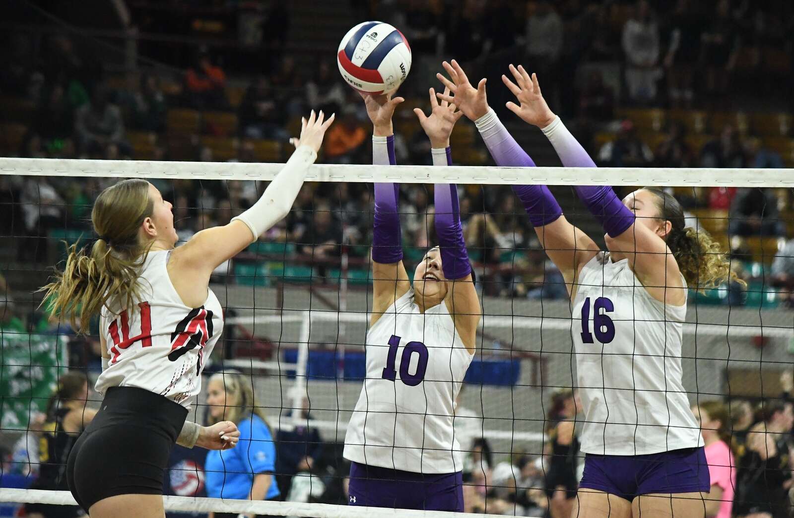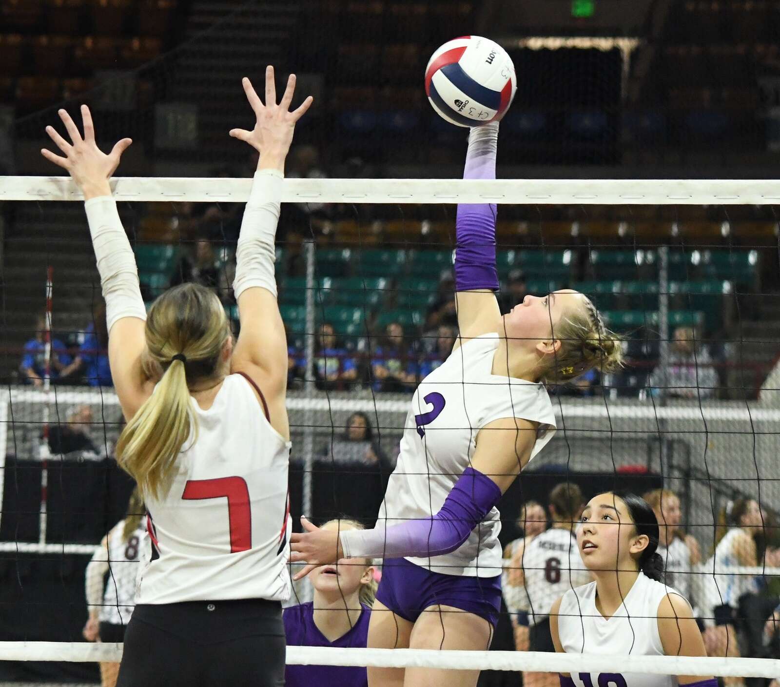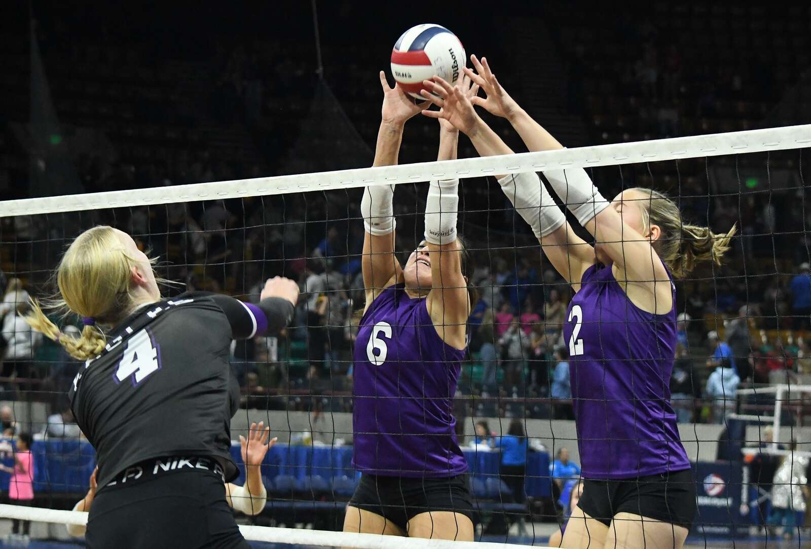 Aided by junior Vivien Clance (2), Bayfield senior Grace Barber (6) blocks Stargate School's Scotlyn Mackintosh (4) during 3A state championships action Friday afternoon inside the Denver Coliseum. (Joel Priest/Special to the Herald)