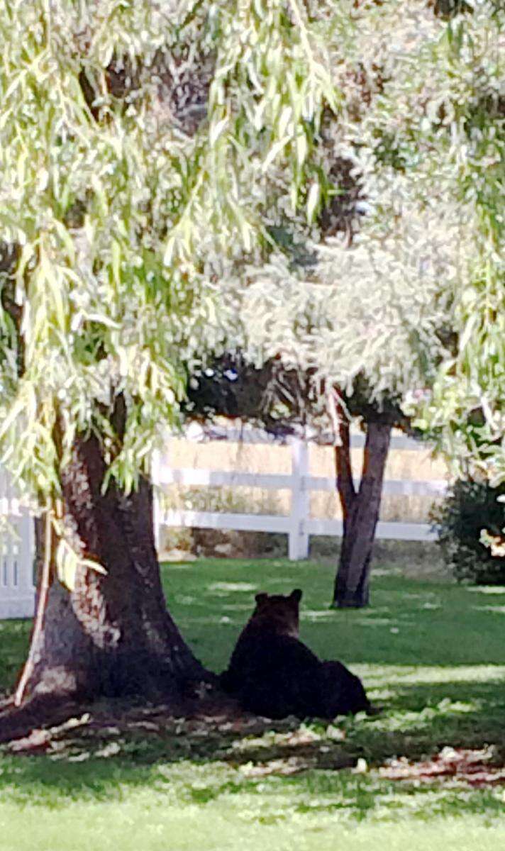 A large black bear was hanging out in downtown Bayfield on Tuesday afternoon. He visited a yard and apple orchard on Bayfield Parkway, then ran toward the direction of the Pine River and Eagle Park.