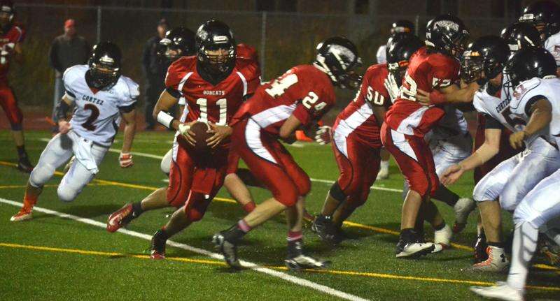 Ignacio quarterback Zach Weinreich (11) follows a batch of blockers while looking for running room last Friday against 2A Montezuma-Cortez at IHS Field. The Bobcats came as close as 12-8 at halftime and 18-14 with 9:15 remaining in the game, but came up short of their first win in 2015 in falling 26-14 against MCHS. Freshman Lawrence Valdez, via Weinreich's arm, and senior Tyler Beebe scored Friday's touchdowns. Now 0-4 overall, Ignacio wraps up its Homecoming week by starting 1A Southern Peaks Conference play at 7 p.m. tonight against Walsenburg John Mall. The Panthers stand 2-2 overall-most recently 47-0 winners over 1A Pueblo Dolores Huerta Prep. The Panthers will hope to avenge their own Homecoming loss to the 'Cats last fall.