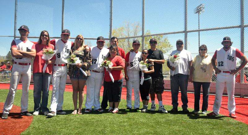 Standing with their parents/families, Ignacio baseball recognized its seniors last Saturday after a 6-1 win over Dolores at IHS Field. From left is Dalton Labarthe (arms crossed), Timmy Plehinger-Williams (9), Nick Sanchez (17), Juanito Medina (5) and Zach Weinreich (12). Read more about the win on Page 1B.