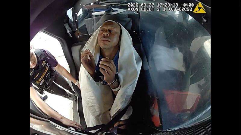 In this image from police body camera video released by the Martin County, Fla., Sheriff's Office, golfer Tiger Woods is taken into custody by sheriff's deputies following a car crash in Jupiter Island, Fla., Friday, March 27, 2026. (Martin County Sheriff's Office via AP)