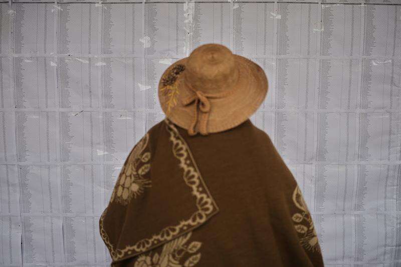 A person checks the rolls during a presidential runoff election in El Alto, Bolivia, Sunday, Oct. 19, 2025. (AP Photo/Ivan Valencia)