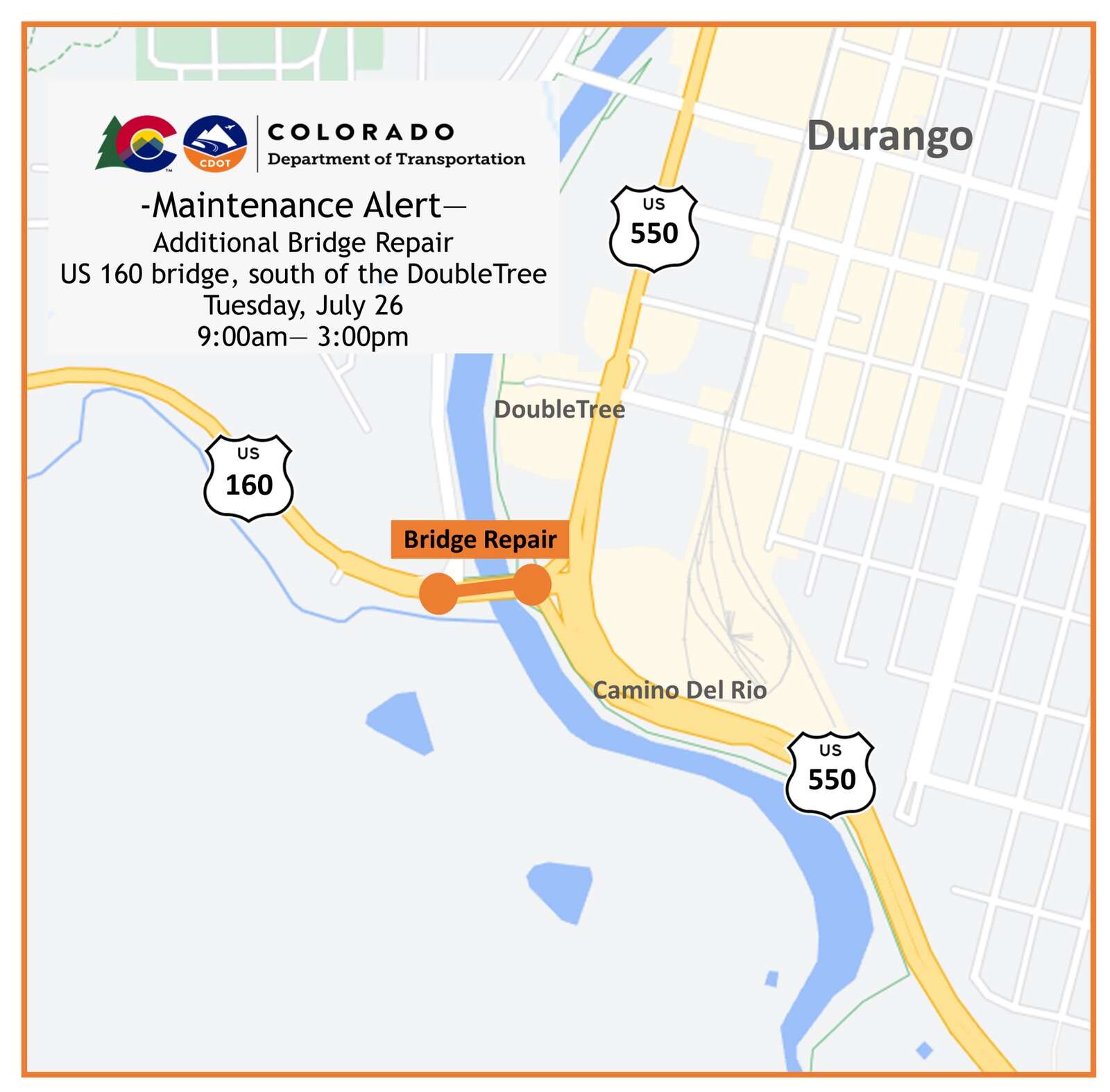 Colorado Department of Transportation will perform additional repair work on the U.S. Highway 160 bridge near the DoubleTree Hotel intersection from 9 a.m. to 3 p.m. Tuesday.