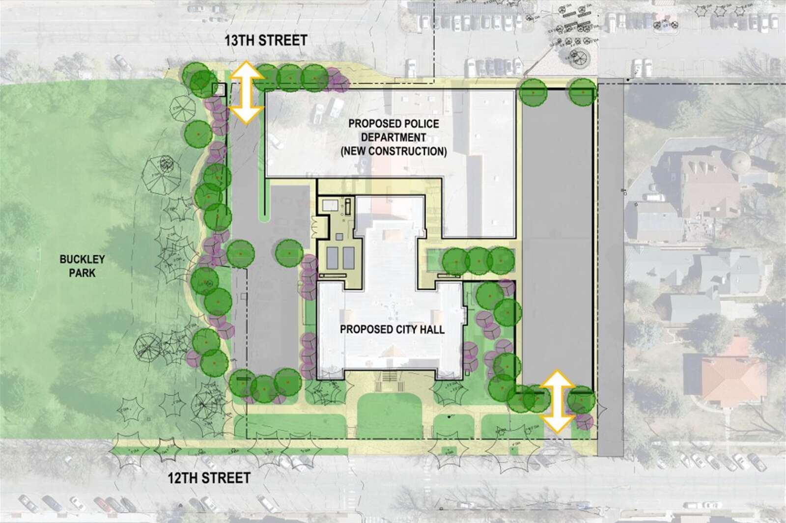 The site layout change does not impact the historic high school, and it preserves Buckley Park – including the sledding hill – and saves additional trees in the area. These are community treasures, and we’re committed to keeping them intact for generations to come. We stand committed to meeting all city codes, including parking, by using the current police department and city hall sites as off-site parking for the new City Hall and Police Department.