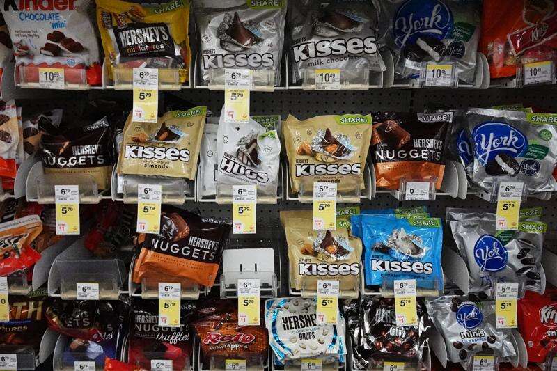 Hershey's chocolate are displayed on shelves at a grocery store in Mount Prospect, Ill., Monday, Oct. 20, 2025. (AP Photo/Nam Y. Huh)