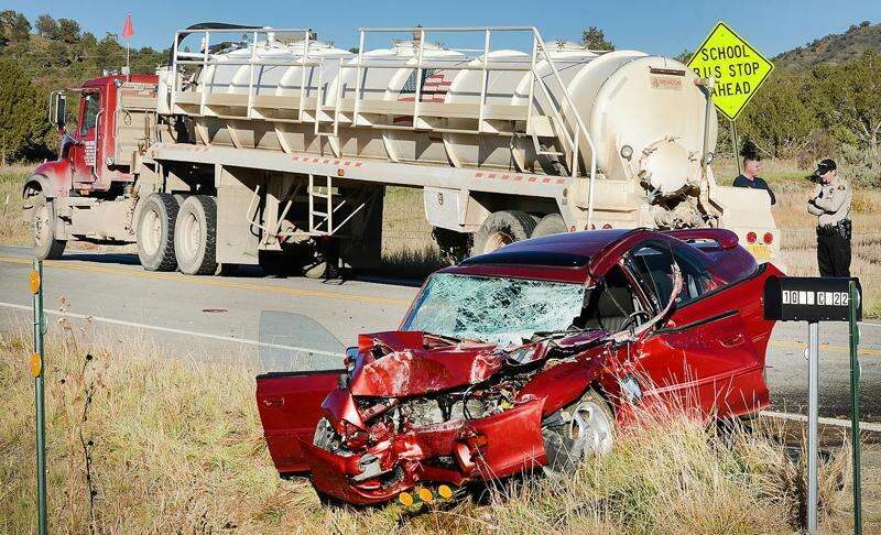 Two men in a Subaru traveling southwest on County Road 223 struck a tractor-trailer carrying oil field production water after the driver of the Subaru drifted off the right side of the road then over-corrected about a quarter mile north of U.S. Highway 160 at approximately 4:30 p.m., said Durango Fire & Rescue Authority Battalion Chief Randy Black. The two men were taken to Mercy Regional Medical Center for treatment. The male driver of the truck was not injured, Black said. The Los Pinos Fire Protection District also responded to the scene.