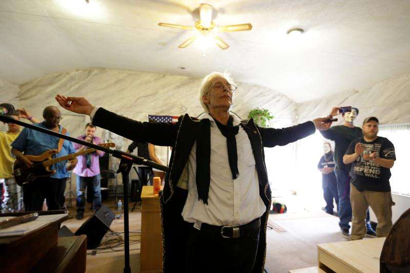 “If we weren’t intimidated, this would be the sacrament box, folks – this is the box we keep our sacrament in,” the 59-year-old said, holding up a small wooden box that a fellow church member presented to him. “Unfortunately, there’s no sacrament in it today, so just pretend, folks.”