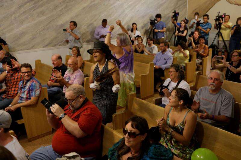 About two dozen police officers kept watch over the church, but no arrests were made during the two-hour service that included lively performances of funk and reggae songs. The music brought the congregation to its feet several times inside the small chapel in a residential area on Indianapolis’ south side.