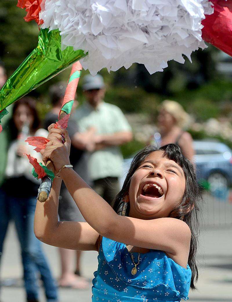 Gazpacho Restaurant held its annual Cinco de Mayo Fiesta on Saturday, with proceeds going to support the Ballet Folklorico de Durango program and Fort Lewis College’s El Centro de Muchos Colores. Seven-year-old Alondra Cruz-Mendoza, daughter of Carlos Cruz and Jeamileth Mendoza, takes a swing at a piñata brought over from Guadalajara especially for the occasion, courtesy of Chiquita’s Tiendita. Shop owner Vicente Garcia said a family friend made it “duro” to better withstand the beating of a dozen or so kids.