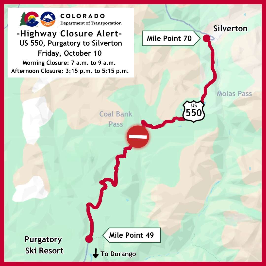 Coal Bank and Molas passes on U.S. Highway 550 north of Durango will close for two periods during the morning and the evening on Friday as 18 pre-built housing units are delivered to Silverton.