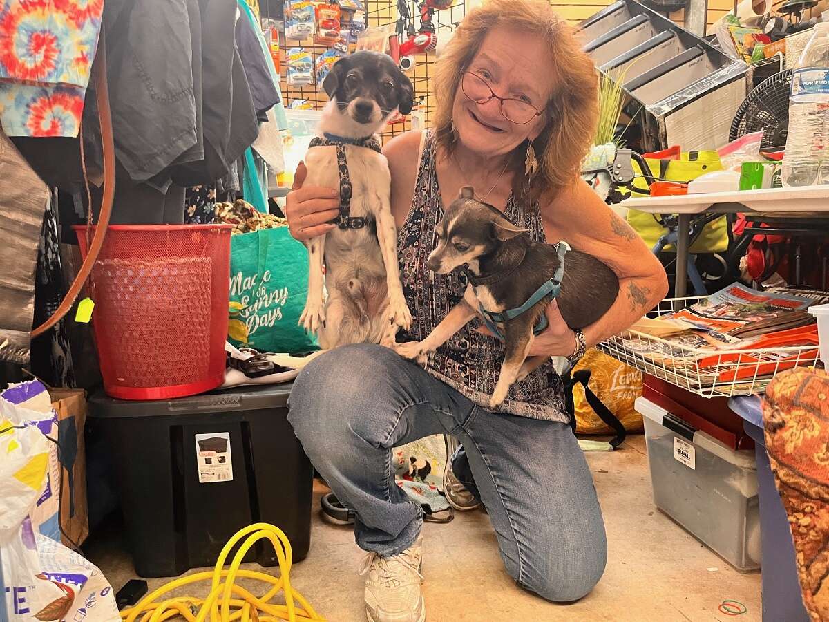 Colorado Springs resident JoAnn Antaya poses with her dogs at her booth where she sells a variety of items at the Colorado Springs Flea Market. (Stephanie Rivera/CPR News file)