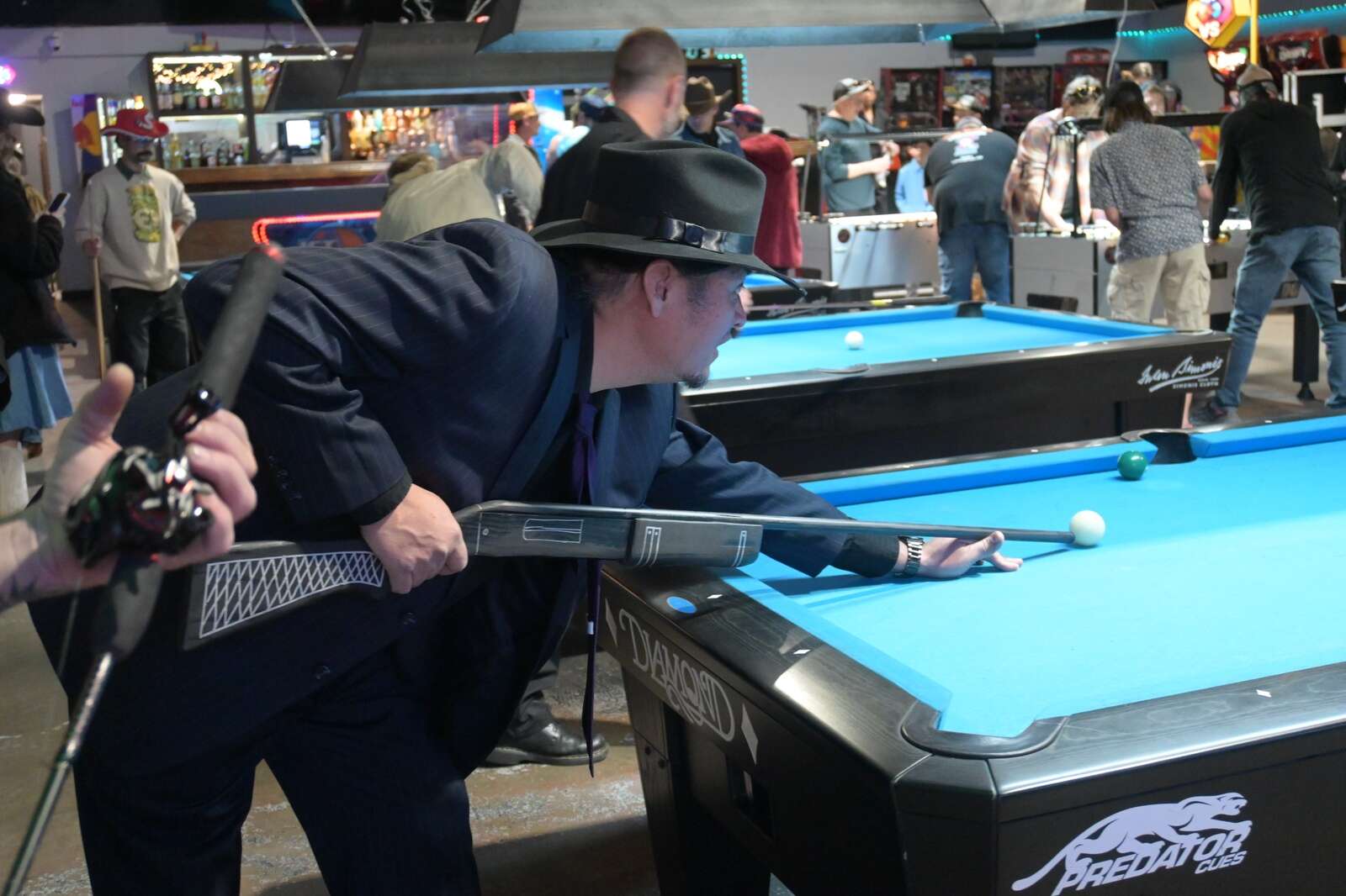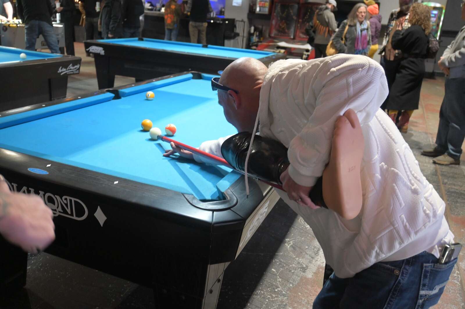 Bragging rights for the most creative substitute cue went to Robert Davin, who used his prosthetic leg to shoot pool balls.