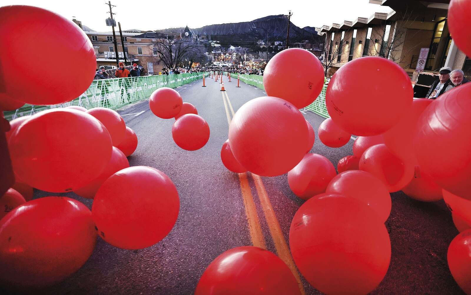 Dump trucks at the top of 11th Street and East Second Avenue release red balls on Friday during Snowdown’s Red Ball Express hosted by Rotary Clubs of La Plata County and Alpine Bank. All proceeds from the event support Rotary projects in La Plata County and local programs for people in need or at risk. Adoption tickets were available for a $5 donation that allows participants to adopt two of the red balls. The first two balls down the course win that adoption ticket holder $5,000. The second pair wins that adoption ticket holder $2,000, and the third pair wins that adoption ticket holder $1,000. According to the Rotary website. (Jerry McBride/Durango Herald)