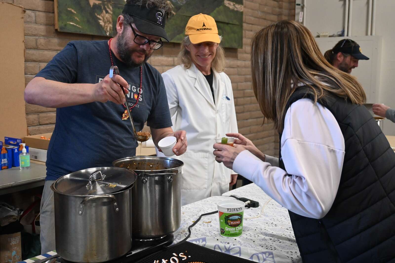 Matthew Lodowski, left, Jan Hogstrom and Josh Jones entered green chili in Saturday’s Snowdown chili cook-off. (Elizabeth Pond/Durango Herald)