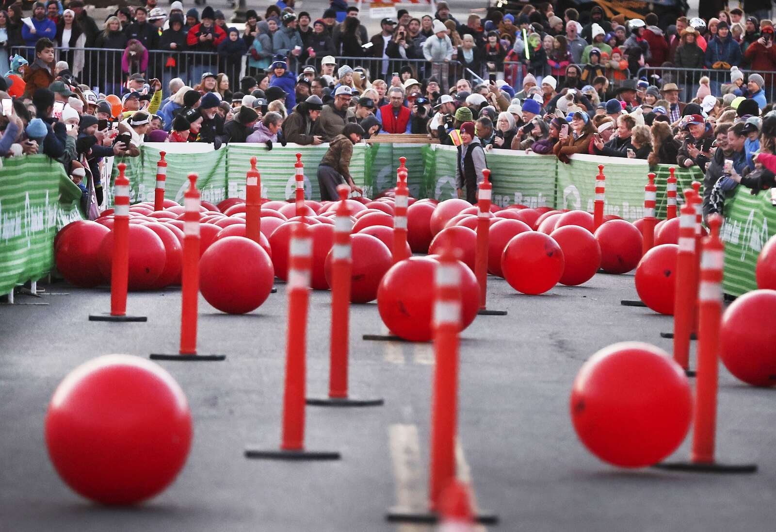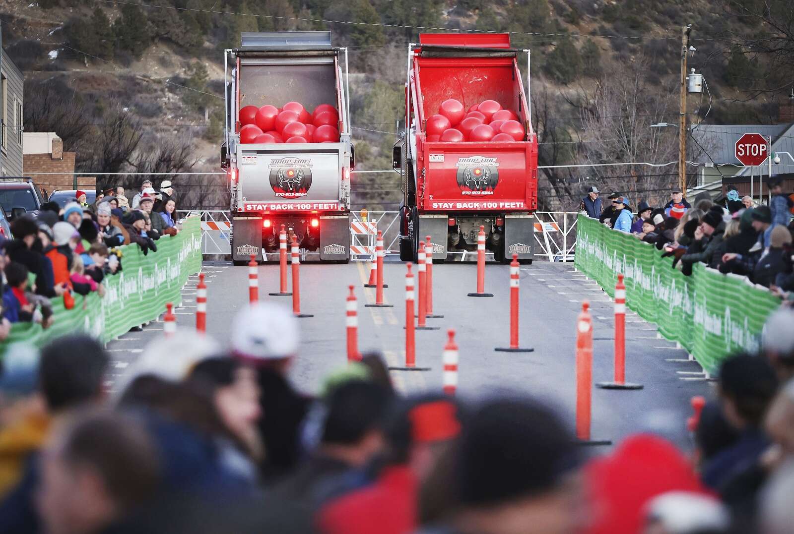 Dump trucks at the top of 11th Street and East Second Avenue waiting to release the red balls on Friday during Snowdown’s Red Ball Express hosted by Rotary Clubs of La Plata County and Alpine Bank. All proceeds from the event support Rotary projects in La Plata County and local programs for people in need or at risk. Adoption tickets were available for a $5 donation that allows participants to adopt two of the red balls. The first two balls down the course win that adoption ticket holder $5,000. The second pair wins that adoption ticket holder $2,000, and the third pair wins that adoption ticket holder $1,000. According to the Rotary website. (Jerry McBride/Durango Herald)
