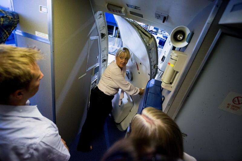 The frequent fliers were all smiling and laughing – and quietly hoping to never use an evacuation slide again. Doing so would mean their plane had just crashed.