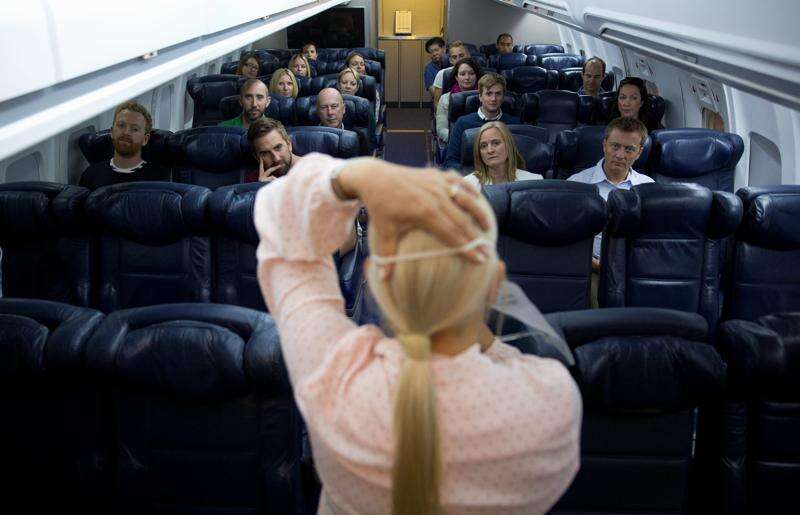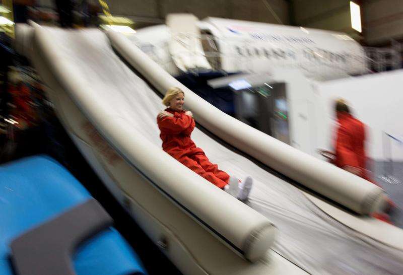 The slide demonstration was part of a half-day safety course that encourages passengers to be aware of their surroundings and familiarize themselves with what happens in an emergency. The two dozen participants learned the best way to brace for a crash, how to open aircraft doors and why to wait until exiting a plane to inflate life vests.
