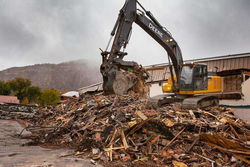 Jason Noonan, with S & S Construction of Durango, operates a backhoe as he helps demolish the former 2nd Avenue Sports building to make room for the construction of a new First Southwest Bank at East Second Avenue and College.