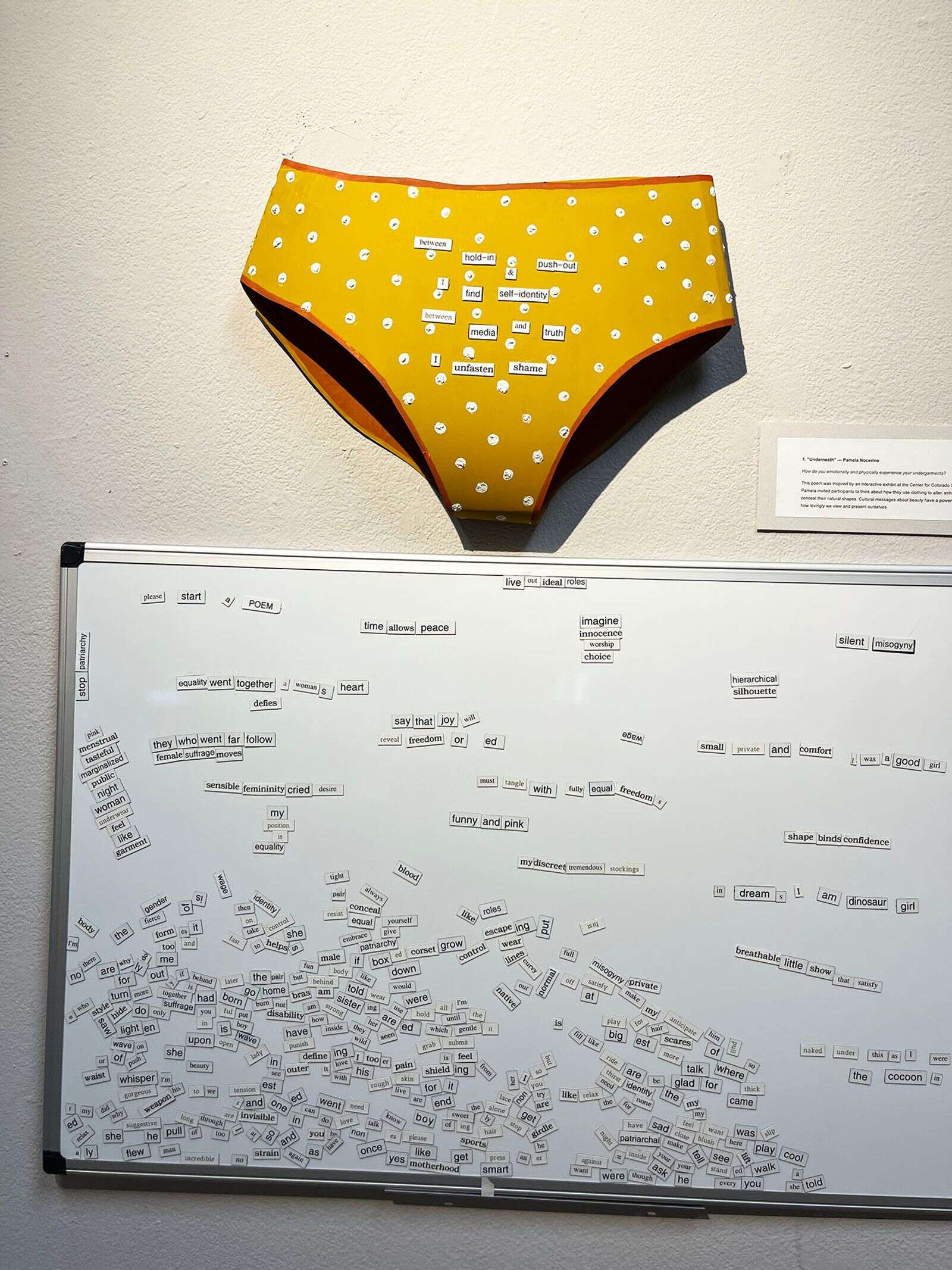 Nocerino’s poems are mounted as art objects. One playful installation activates one aspect of her practice. “Underneath” has two parts: wall-mounted underpants over a magnet board filled with words. Viewers are invited to create a poem about one’s relationship to undergarments. Nocerino’s latest chapbook is for sale on a book table: “A Palace of Waning.”
