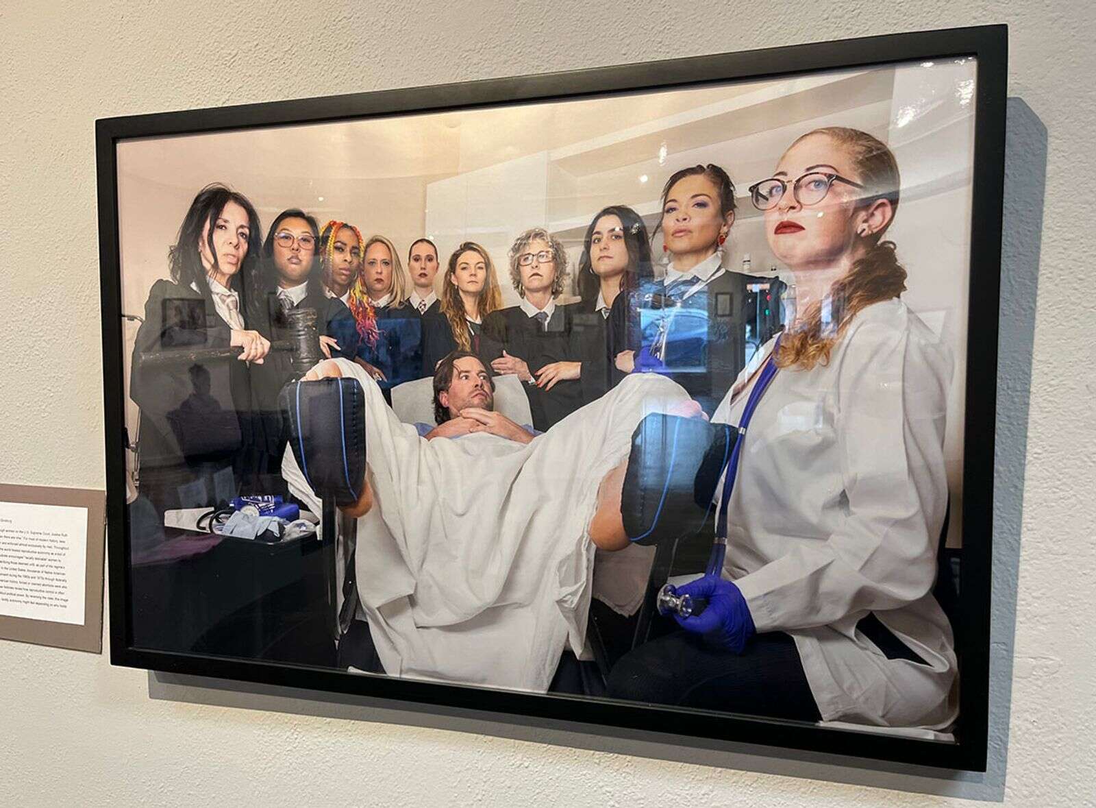 Goodman’s staged photographs provocatively reimagine current dilemmas. From the “When It’s You” series, a collaborative project spinning off the famous Holocaust poem by Martin Niemöller, Goodman targets book burning in “Fahrenheit 45-7,” the American health industry in “It’s all in your head,” and most satirically, the Supreme Court after reversing Roe V Wade in “When there are nine.” Nine women plus a female doctor surround a male patient who is strapped into stirrups on an examining table. Funny and frightening, it speculates on who has the right to choose and what to extract.