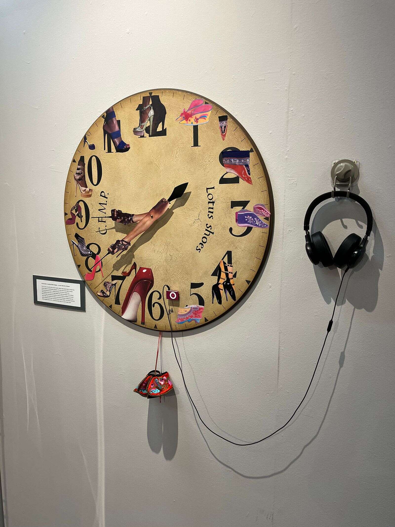 “You’ve Come a Long Way, Baby,” is Hayes’s strongest piece. A clockface carries images of high heels with a tiny pair of oriental slippers dangling below. A pair of earphones lets you listen to the music.