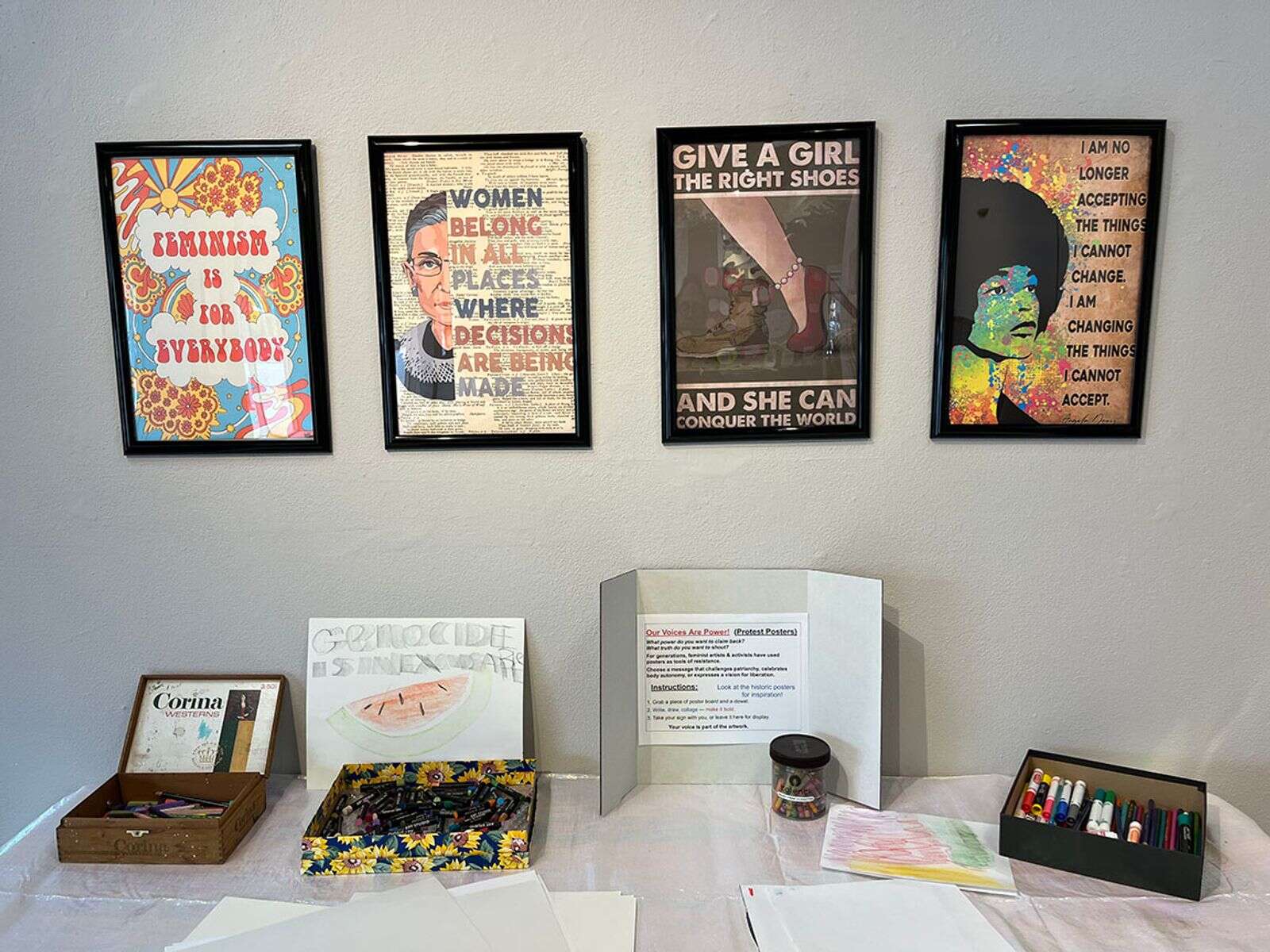 The show features work by three presenters: mixed-media visual artist Judy Hayes, poet-performer Pamela Nocerino, and conceptual photographer Savanna Goodman. Along with interactive stations where viewers can respond to Feminist posters, write a poem, or post a comment, there’s a short video about Suffragettes and the #MeToo movement.