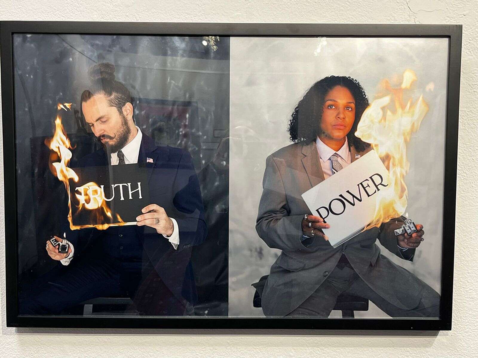 The show offers views from two generations of feminists. Hayes, who admits to an awakening in the 1970s, exhibits paintings and collages that burn into the present. Nocerino and Goodman ignite post-#MeToo revelations through poetry and stunning conceptual photographs.