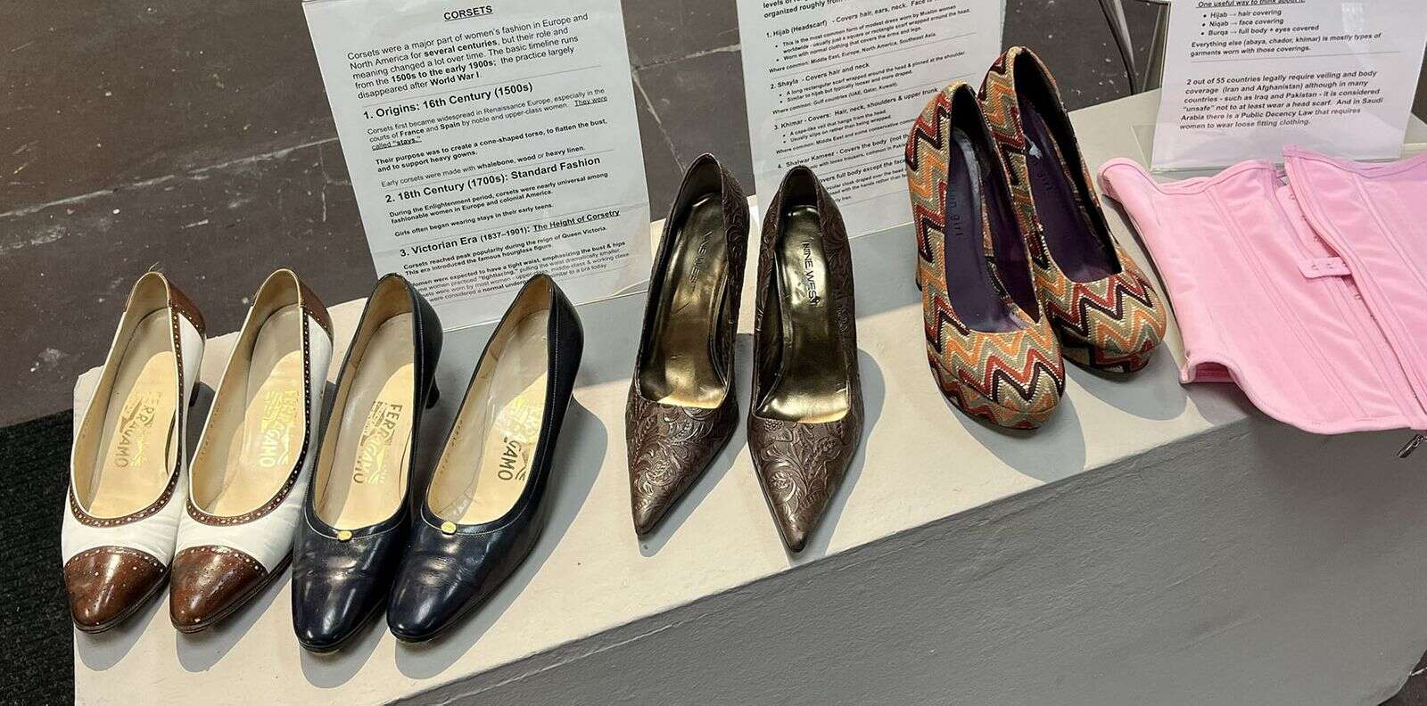 “Exploring Feminism: Beauty or Bondage?” the new exhibit at The Durango Art Center, admonishes viewers to pay attention to the subordination of women. Stiletto heels, head scarves and a lone pink corset lie in wait.
