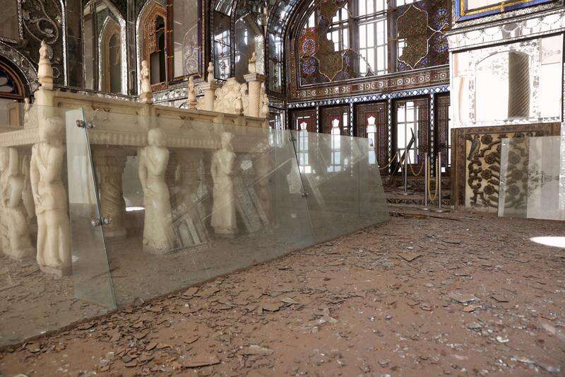 At Golestan Palace, shattered glass from the mirrored ceilings blanketed the floors alongside broken archways, blown-out windows and damaged molding scattered below its glass-mosaic walls, according to Associated Press video taken March 3.