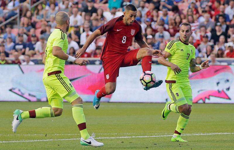 Associated Press file<br><br>United States forward Clint Dempsey (8) controls the ball as Venezuela’s Jose Manuel Velazquez, left, and Pablo Camacho (17) defend in the first half during an international friendly match in Sandy, Utah. On Sunday, July 16, 2017, the U.S. Soccer Federation announced that Dempsey, midfielder Michael Bradley and goalkeeper Tim Howard are among six additions to the U.S. roster for the knockout phase of the CONCACAF Gold Cup. U.S. coach Bruce Arena also added forward Jozy Altidore, midfielder Darlington Nagbe and goalkeeper Jesse Gonzalez.