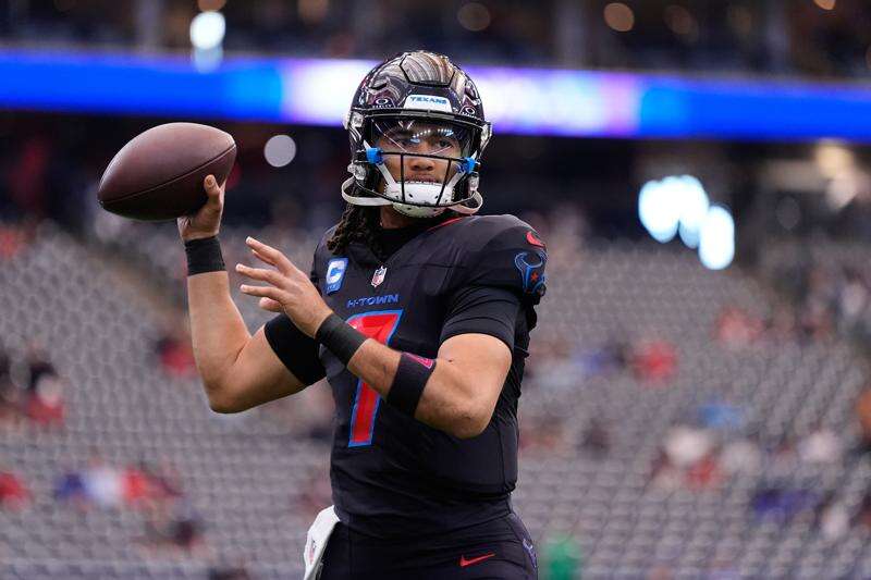 Houston Texans quarterback C.J. Stroud (7) throws before during an NFL football game against the Indianapolis Colts in Houston, Sunday, Jan. 4, 2026. (AP Photo/Ashley Landis)