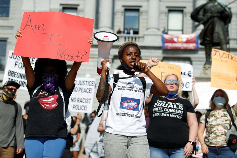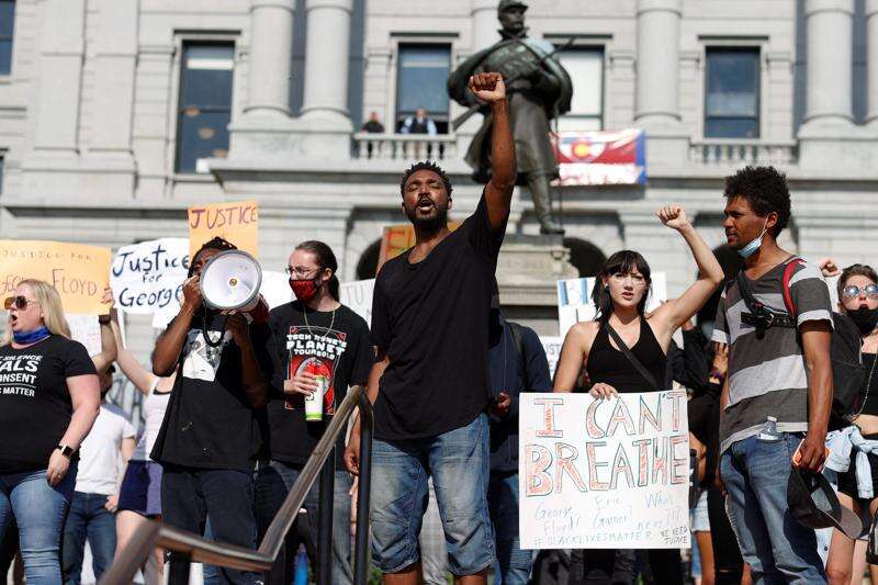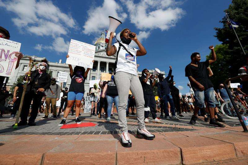 Javon Block leads a chant during a protest outside the State Capitol over the death of George Floyd, a handcuffed black man in police custody in Minneapolis, Thursday, May 28, 2020, in Denver. Close to 1,000 protesters walked from the Capitol down the 16th Street pedestrian mall during the protest.