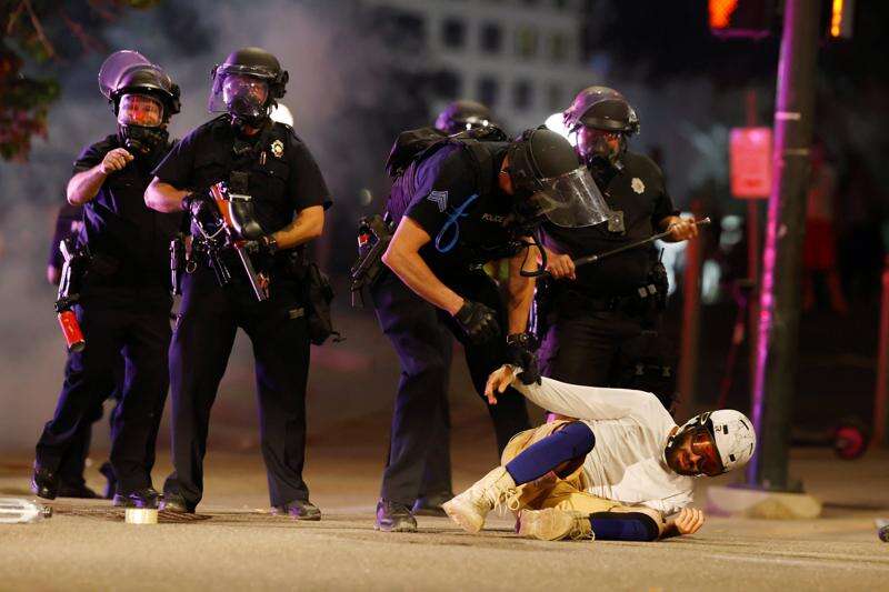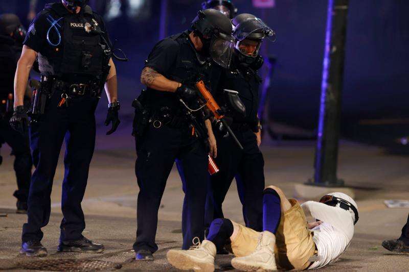 Denver Police Department officers stand over a man who fell to the street after they used tear gas and rubber bullets to disperse a protest outside the State Capitol over the death of George Floyd, a handcuffed black man who died in police custody in Minneapolis, late Thursday, May 28, 2020, in Denver. (AP Photo/David Zalubowski)