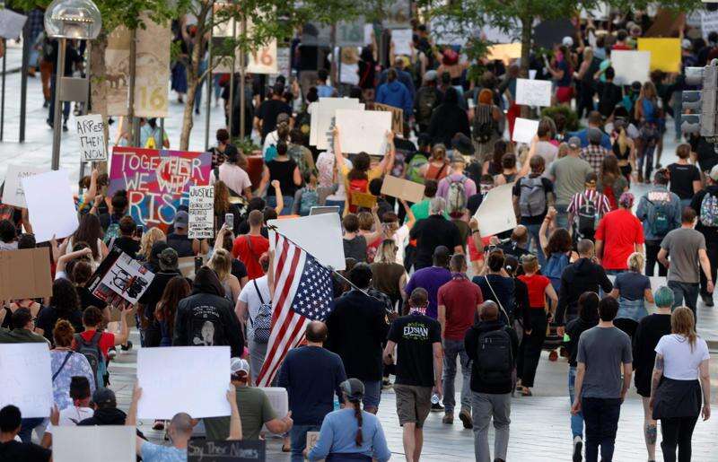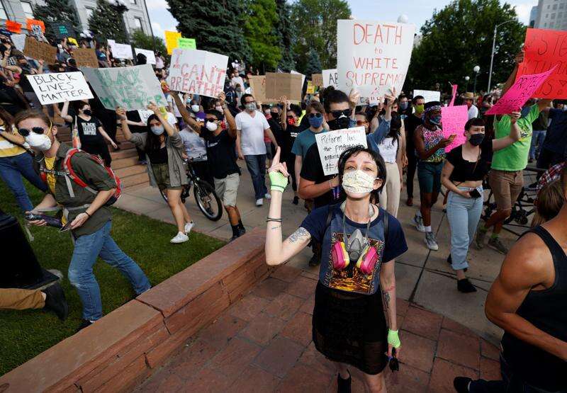 Participants march during a protest outside the State Capitol over the death of George Floyd, a handcuffed black man in police custody in Minneapolis, Thursday, May 28, 2020, in Denver. Close to 1,000 protesters walked from the Capitol down the 16th Street pedestrian mall during the protest.