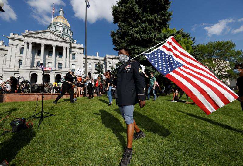 Aubrey Rose, who earned the rank of staff sergeant during four tours of duty in the U.S. Army, holds an American flag during a protest outside the State Capitol over the death of George Floyd, a handcuffed black man in police custody in Minneapolis, Thursday, May 28, 2020, in Denver. Close to 1,000 protesters walked from the Capitol down the 16th Street pedestrian mall during the protest.